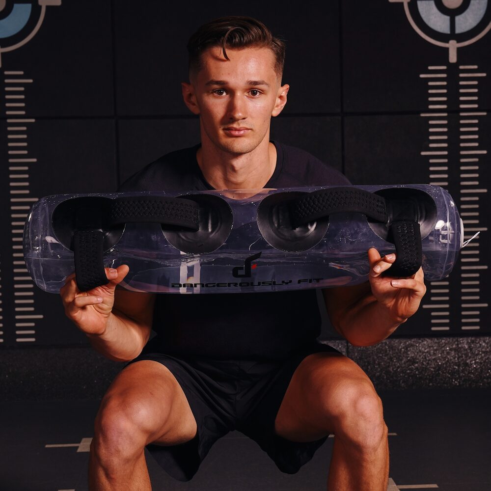 The Aqua Power Bag is soft, which makes it a safer, more user friendly alternative than the barbell when practising complex movements. Using a ‘live’ weight rather than a ‘dead’ weight allows the user to progress traditional strength movements such as squats and deadlifts without overloading the spine. The bag can also be used to shoulder the weight unilaterally creating rotational and side bending torque on the trunk, which forces the deep superficial trunk muscles to engage at a greater degree to maintain optimum postural alignment.